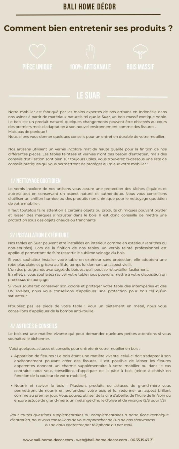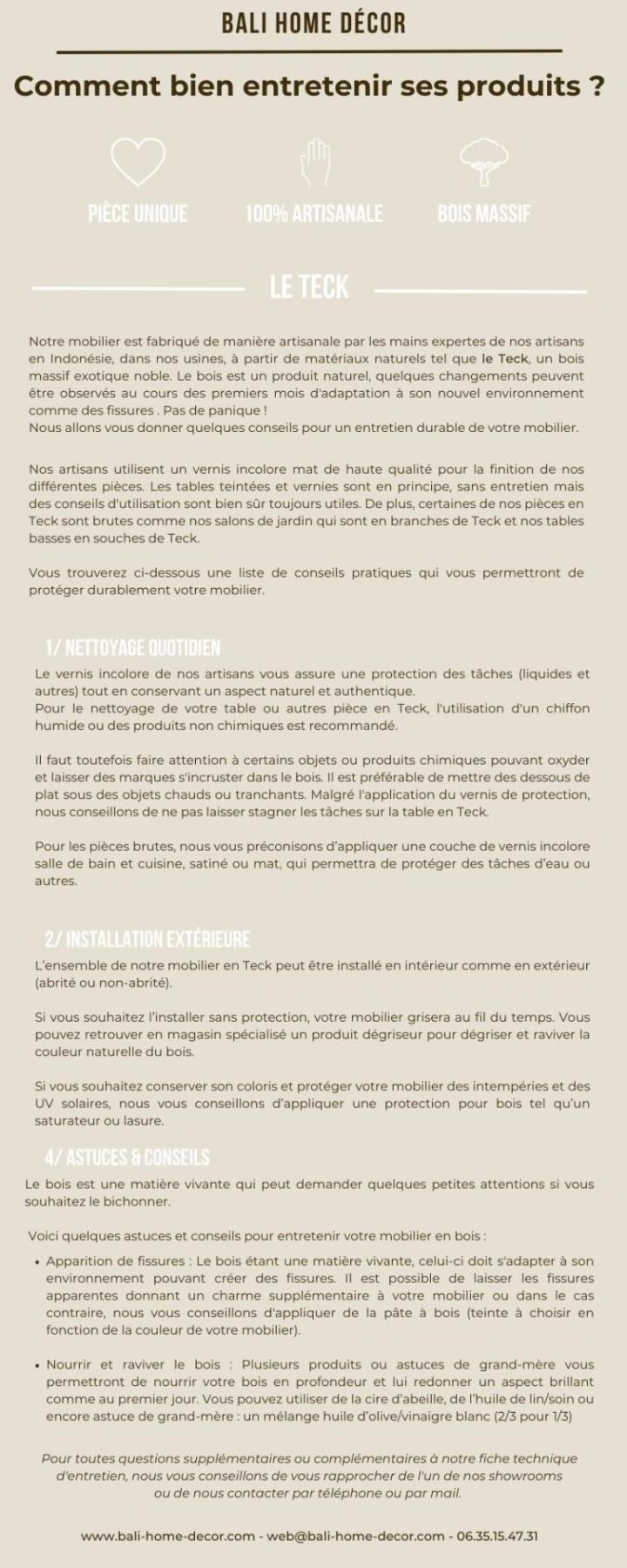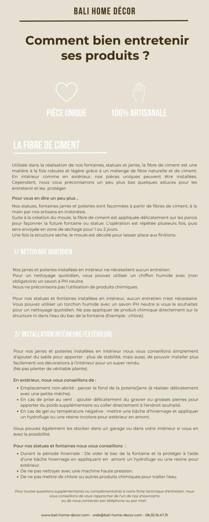 Confectionnées à partir de matériaux naturels et nobles tel que nos bois massif : Le Suar et le Teck pour nos tables et autres mobiliers ou, de fibre de ciment pour nos jarres, fontaines et autres décorations, voici quelques conseils qui vous permettront d'entretenir nos merveilles de Bali.
